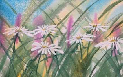 Then remove the masking fluid, paint the stems, the centre of the daisies and shade the petals.