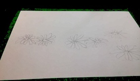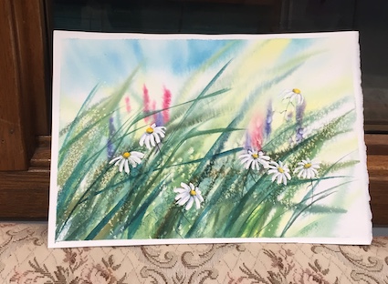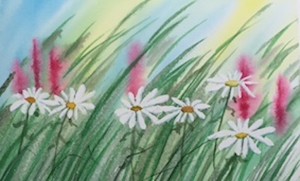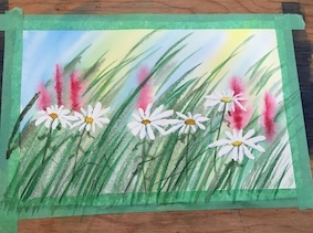 Then remove the masking fluid, paint the stems, the centre of the daisies and shade the petals.