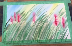 Thoroughly wet the paper, then strokes of yellow and blue for the sky, strokes of green for the first batch of grass, add the out of focus foxglove. Sprinkle with salt.