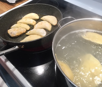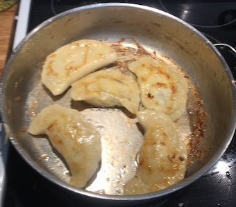 I, of course, had opted for a recipe that requires both. (Boil first, then fry.) Well, at least mine didn’t burst open in the boiling water and made it into the frying pan in one piece.