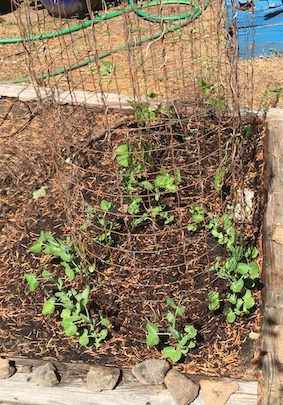 The two-year-old packet of bean seeds have done their job. Not so much the brand new packet of pea seeds, but they’re also coming along. No sign so far of the sunflower seeds planted in the middle sprouting. Methinks the birds may have got to them.