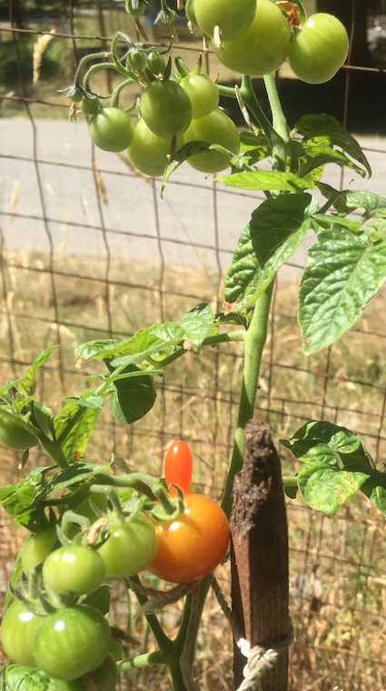 Peas are doing okay, as are pole beans. (Yum.) Cherry tomatoes also coming along nicely, including this very strange looking one.