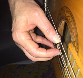 But wait! There is something cool that I can do. I watch him strum with the side of his thumb, rather than his finger. I try it. Oh, my god! It’s a completely different sound! A completely different vibration! Excellent!