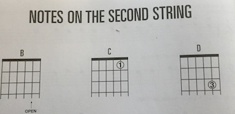 Finally got to lesson two last Monday. In between, yes, I picked up guitar for at least a few minutes every day. Played the little tune I’d made up early on, played my version of Twinkle, Twinkle Little Star, worked on notes and a bit on chords.