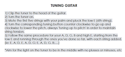 Homework: Practice tuning, practice claw hand, use tuning gizmo to check on notes and chords. Okay.