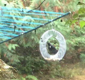 Great news! The breakfast show is back on. At least one Stellar’s jay (perhaps the home invader) has clocked the peanut feeder. I wake up in the morning to insistent “Ack, ack, acks” – a demand for fresh peanuts. It’s not the first thing I do, because the feeder is visible from the diningroom window and, in return for providing peanuts, I want a show.