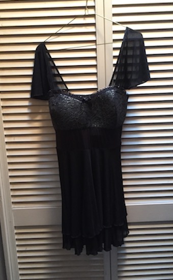 She found a plunging neck top, cut it off and added a flared, layered skirt of a different black fabric and created the perfect Rita dress.