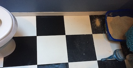 Not in the diningroom, thankfully. No, Stella started peeing on the bathroom floor, halfway between her toilet and mine. It didn’t seem to matter how clean I kept her box.