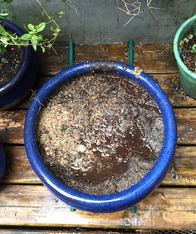 One tiny drainage hole in a huge pot, which I’d obvious not positioned above a space between the deck planks. Used another pointy stick to clear it out where it was packed solid with mud. Hmm. The pot clearly needs a bigger drainage hole or more drainage holes or something. The question is how to increase drainage without cracking the ceramic pot, rendering it useless. What sort of tool would this require and who has one? The best I could manage is large nails and a hammer which I’m pretty sure would just wreck the pot. Suggestions welcome.
