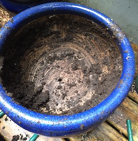 Well, after the first heavy rainfall of the autumn, one of the big ceramic pots (the one which used to contain the butterfly bush killed by last winter’s deep freeze) was flooded. The water just didn’t drain away. Tried poking around with a pointy stick, but to no avail. Tried raising it off the deck with a couple of thin pipes. Nope. Why wasn’t it draining? At some point I was going to have to clear it out and figure out what the problem was. (I do want to get another butterfly bush for it next spring.) I figured yesterday was a good day, as it would keep me outside with Maisie for her first foray into the great unknown.