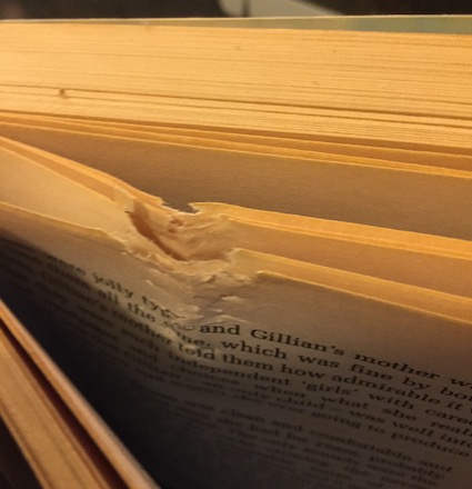 My beloved Clara only ever chewed one book, out of the countless numbers she had access to, and it was, OF COURSE, a library book that I then had to replace. Not even one I liked overmuch. So now I have an ex-library hardcover copy of Donna Tartt’s The Goldfinch with the cover half chewed off.