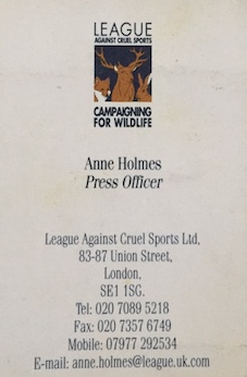 Yes, once upon a time I worked at the League Against Cruel Sports. Started off as an agency job after I left the Greenpeace UK office and turned into an offer of a full time position, which I accepted despite the low salary and it not really being an issue about which I felt any great passion, but because I really liked a lot of the people there and the ED allowed me to put the word “knickers” in the title of the first press release I wrote for them. (Something to do with a Countryside Alliance protest in Westminster.) But that’s another story for another day.