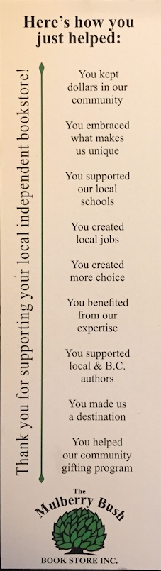 When I find myself in Qualicum Beach for any reason I always go into the Mulberry Bush and buy at least one book for all the reasons they list on their bookmarks. (Oh, to have a shop like this here on the island!) And I usually discover an author who is new to me.