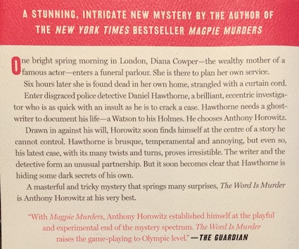 I recognised the name Anthony Horowitz. I knew of him as the creator of Foyle’s War and Midsomer Murders. I also knew he’d written the screenplay for The Magpie Murders, which I watched not all that long ago. I didn’t know it had originally been one of his novels. I’d always thought of him as a television writer and had no idea he was also a novelist. I can’t remember ever seeing a novel by Horowitz in the mystery section of any bookshop, which is odd, as it turns out he’s written dozens.