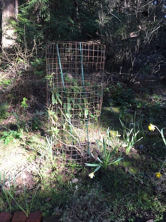 One of the joys of rhododendrons is that, unlike lilacs and (as I learned to my cost) hydrangeas, deer don’t snack on them. Or that’s the theory. Unfortunately last year this particular rhodo proved to be the exception to the rule, forcing me to put a cage around it to protect it. The cage clearly didn’t help, as it’s still looking pretty sad and there is no sign of any purple flowers this year.