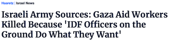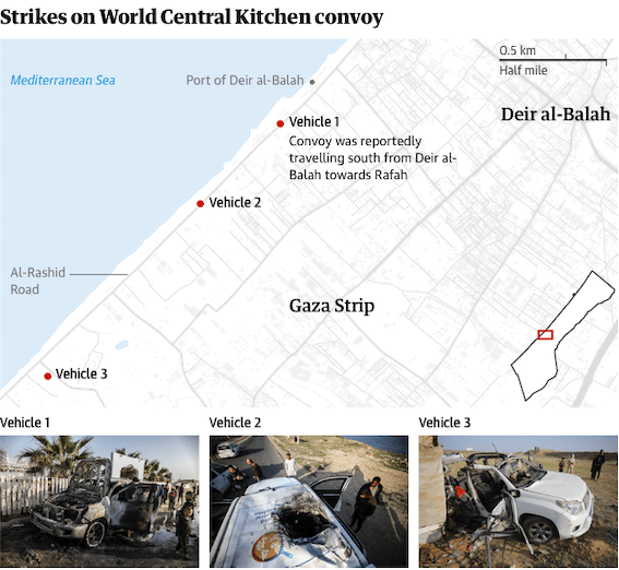 This claim was challenged in the Guardian today in an article which (based on reporting in the Israeli newspaper Haaretz) states: “an Israeli drone fired three missiles, one after the other, at the convoy of three armoured cars – all of which were clearly marked on the roof and sides with the WCK’s logo – because of a suspicion that an armed militant was travelling with them”. A suspicion? Fuck you.