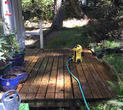 First, get the power washer out of the shed. Attach hose, plug in, get started. Erm. Why is the water coming out in a trickle? Grr. Do I have to ring Joe to get him to remind me how to use power washer? (Only my second time.) Think. Oh, right, there’s an actual On button on the plug itself. Push on button. Water flows.