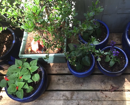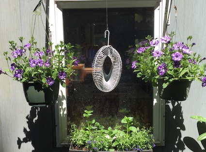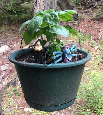 For a couple of years my attempts to include basil in the pots of herbs by the kitchen door were thwarted by the fact that basil is apparently the tastiest thing on earth for slugs. Many a summer’s morning of going outside to find nothing in the basil pots but slug slime. Ugh. Then a solution occurred to me: using hanging pots with wire the slugs cannot navigate. I mentioned this a few years ago to a woman in the garden shop who was complaining about the basil/slug problem. “Genius!” she proclaimed. I don’t know about that and I’m sure I’m not the first person to figure this out, but it works.
