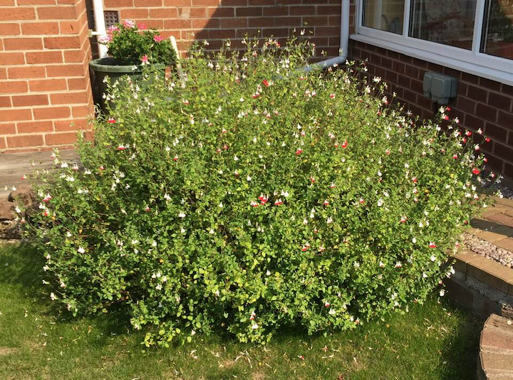 When I was visiting my cousin in England in 2022, I was struck by the number of bees attracted to this shrub, so I asked him what it was. It was called a hot lips salvia. As I wrote last summer, I wasn’t all that taken by the white and red flowers, but I was excited to discover that there were also vibrant purple and red versions. Unfortunately neither of these (or any other salvias) were available at either of the island garden shops. So, a little while ago, when I heard a friend who was in Vancouver was planning a trip to a big garden store while she was there, I asked her to have a look for me. She came back with both purple and red.