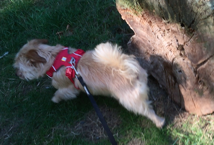 When Jean asked me, shortly after Dexter came into her life, if I would be willing to take him for a walk on the days she was working from home, I said sure and he came with me very willingly. We did beach walks; we did wooded walks. Then one day, as soon as I unclipped his leash, he stopped dead in his tracks. A bit of cajoling (tummy tickles were helpful) seemed to do the trick and get him moving again. Commented on this to Jean when I got him home. We just assumed he was a bit of a chancer.