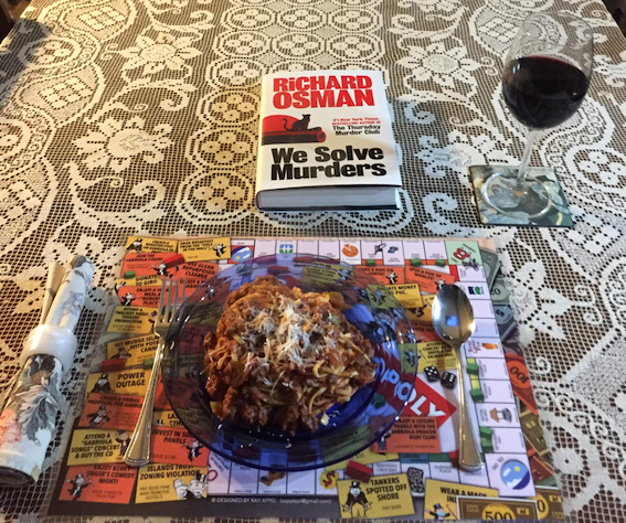 In non-reading news (but related to the first photo), no, I don’t have new placemats. What’s under my plate in the photo is a laminated, island-specific Monopoly board created by my friend Ray. Last time I met him for a pint, he gave me one with a not so subtle hint that perhaps it could feature in one of my “Sunday dinner with” photos on Facebook. (He was quite chuffed when it did.) Regular placemats now reinstated.