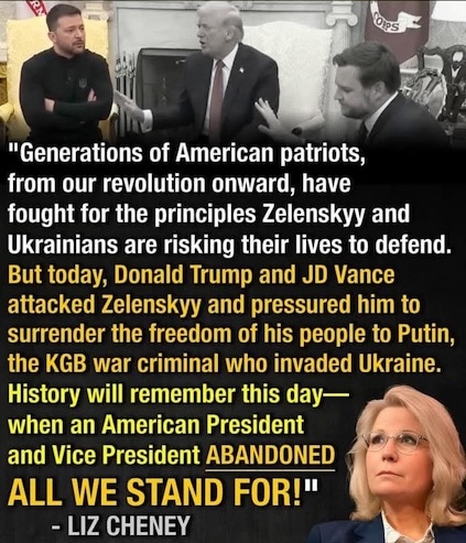 And then, of course, there was last week’s appalling ambush by the Wankmaggot and his misogynist elected (as opposed to unelected Musk) sidekick (and alleged sofa shagger) Vance of Ukrainian president Volodymyr Zelensky. I’ll leave it to the former Wyoming congresswoman to comment.