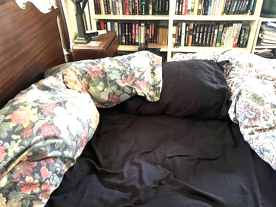 Now, here’s the thing. The first morning I woke up in my own bed, after three nights in his, I awoke to the discovery that somehow in the night, in my sleep, I’d shifted the other two pillows so they were no longer at the head of the bed, but stretched out beside me.
