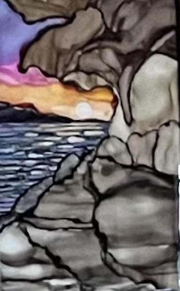 There is a rock formation on the island that is quite famous and has been photographed and painted many times. In early December we went to a local gallery so he could add some glass pieces to his display and I could look for a few Christmas cards by local artists. While we were there, I pointed to an image of said rock formation and said I thought it was the best rendition I’d ever seen. I should have known. When we exchanged Solstice presents there it was.