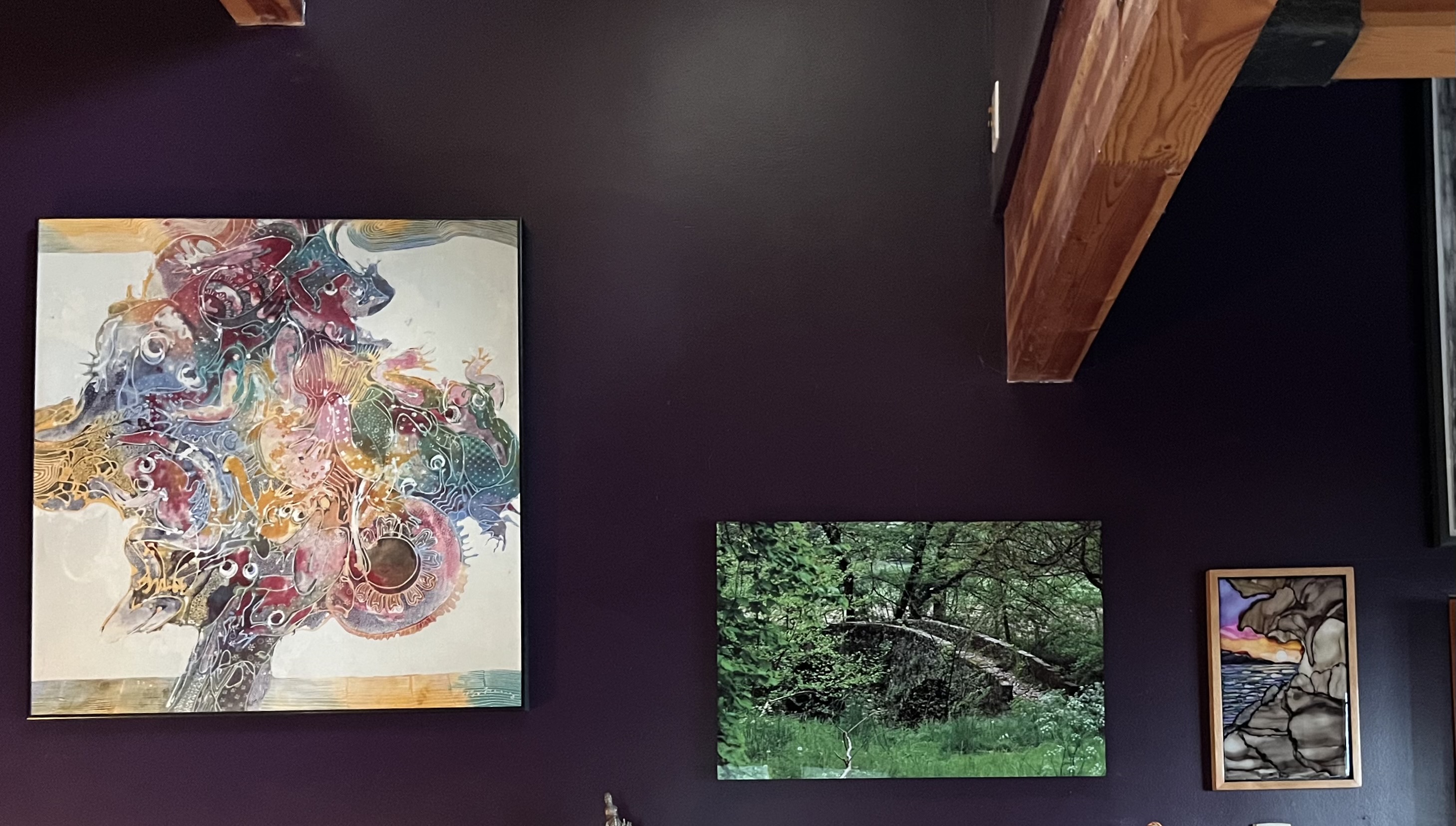 The big batik piece of art was moved into the bedroom from somewhere else in the house, the photograph in the middle is one he took in France of a still-standing Roman bridge, and my new piece of art. Getting there.