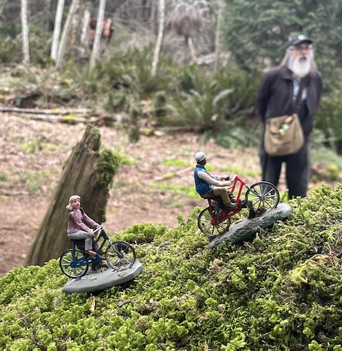 And, down near the roots, almost buried by leaves and encrusted with mud, I find two little cyclists. Obviously they need rescuing and repositioning.